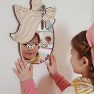 De spiegel is handgemaakt van natuurlijk multiplex, glad geschuurd, en het onbreekbare acryl zorgt voor volledige kinderveiligheid. Lichtgewicht en voorzien van een haak aan de achterkant, waardoor hij eenvoudig aan de muur kan worden opgehangen. Onderhoud is gemakkelijk: het hout afnemen met een droge doek en het acryl voorzichtig reinigen met een microvezeldoek en milde glasreiniger.